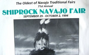 Shiprock Navajo Fair poster featuring the art of W. Charley. The oldest of Navajo Traditional Fairs, September 29 - October 2, 1994. 15.25"w x 24.5"h. Has turquoise mark right side, plus writing on back.
