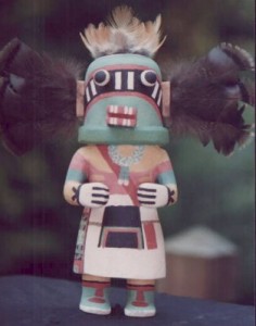 Ho-te. 9" Yellow case mask with pop eyes, snout, and painted with red and yellow stars: Plains Indian feather head dress. Appears in regular Katsina Dance and Mixed Katsina Dance. Purchased from Neil in Polacca.